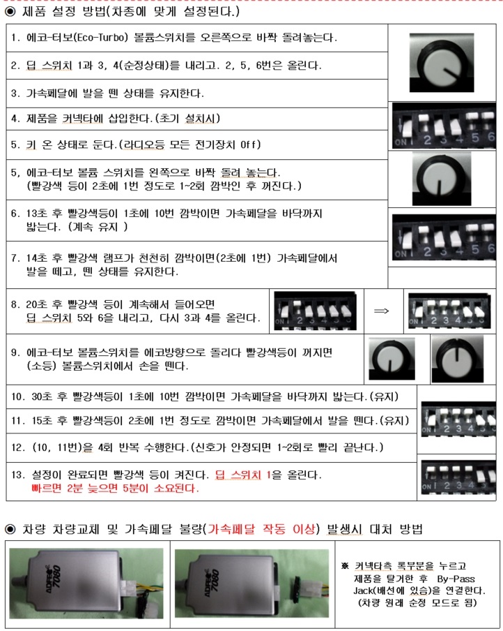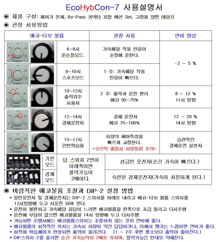 ***출력은 스포츠카, 연비는 하이브리드 카*** ADFEC7080 홈페이지에 Eco-HybCon 소개 문구인데, 하이브콘을 설치하고 운전하면 할 수록 이 말에 전적으로 공감이 간다. Eco-HybCon에 대한 느낌을 나의 경험을 바탕으로 주관적인 관점에서 기술하면 다음과 같다. *차 길들이기(학습기간, 모든 딥스위치 OFF 상태) Turbo=100%(장착 후~50km): 와, 차 힘이 정말 쎄네 Eco=50%(50km~100km): 차 힘이 상당히 쎄네. Eco=100%(100km~300km): 차가 왜이리 굼뜨고 안나가지? 괜히 샀나 하는 갈등이 생기네. 그래도 믿고 끝가지 가보자! (8월 17일자 홈페이지에 게시한 것과 내가 받은 설명서의 길들이기 방법이 약간 틀린데, 내가 받은 설명서를 따랐음.) * 운행 조건별 Turbo-Eco 스위치 위치(4번 딥스위치 ON 상태) Eco=100%: 차가 스므스하게 나가는데 뭔가 2% 부족함. Eco=70%: 차가 상당한 파워를 가져 운전이 아주 편하네. Eco=50%: 캬~! Eco=30%: 캬~아~!! Turbo=100%: 캬~아~아~!!!