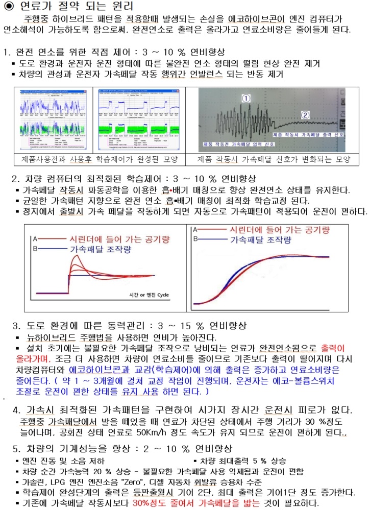 (1). 시동이 매우 잘 걸린다. (2). 출력이 좋아졌고, 언덕길 등판능력이 향상되었다 (3). 에어컨을 켜고도 파워가 넘친다 (4). 악셀을 조금만 밟아도 잘 나간다. (5). 엔진 소음이 아주 정숙해졌다. (6). 디젤차의 굼뜸현상이 개선되었다. (7). 지하 주차장에서 코너링시 끼기긱하는 타이어 마찰음이 현저히 줄었다. 최대장점: New HybCon은 새 차 교체 시 그대로 옮겨달 수 있으니 매우 경제적이다. 현재는 차량길들이기 차원에서 New HybCon의 control 스위치가 Turbo모드인데, 일단은 그 동안 사용해봤던 것들 보다는 좋은 것 같다. 연비는 오늘부터 측정에 들어갔으니 1,000km 주행 후 올리도록 하자.