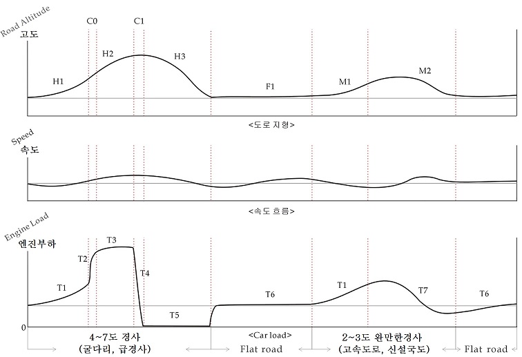 거시적 모델에 입각한 “하이브리드 주행방법”과 “최적운전 유도장치 "SemiAuto, DS”등은 운전자가 실도로 주행시 오르막, 내리막 길, 평지, 가속, 감속, 속도유지, 교통혼잡도 등 다양한 운전조건 상태에서 운전자 이해력 부족과 엔진 효율 맵 이동시에 가속패달을 사용하는데 이때 순간손실이 발생하여 운전자가 최적의 주행결과를 얻지 못하는 문제점이 있었다.